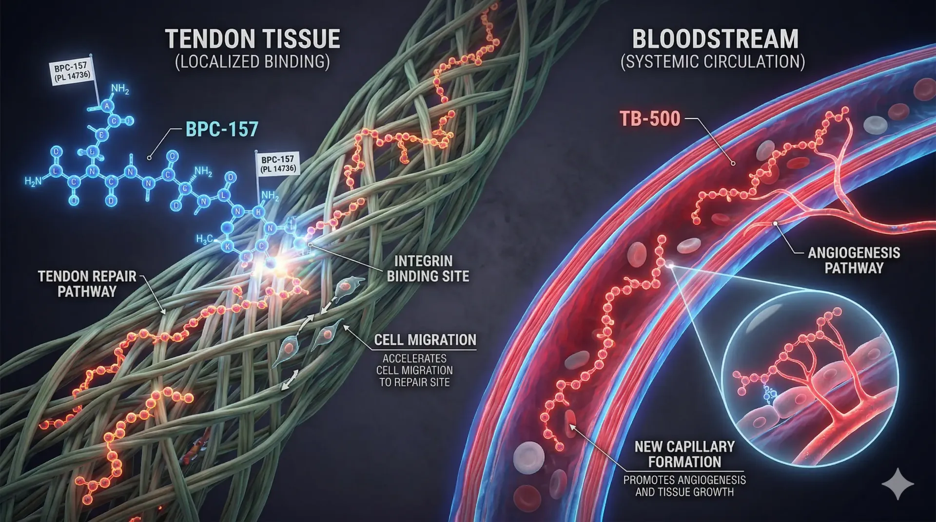 The protocol operates through two parallel but interconnected biological pathways. BPC-157 is a pentadecapeptide derived from a gastric protein sequence. In research models, it has demonstrated effects on angiogenesis (the formation of new blood vessels), collagen synthesis, and the modulation of growth factor expression in injured tissue. These mechanisms position it primarily as a localized repair agent, particularly effective in soft tissue environments like tendons and ligaments.
